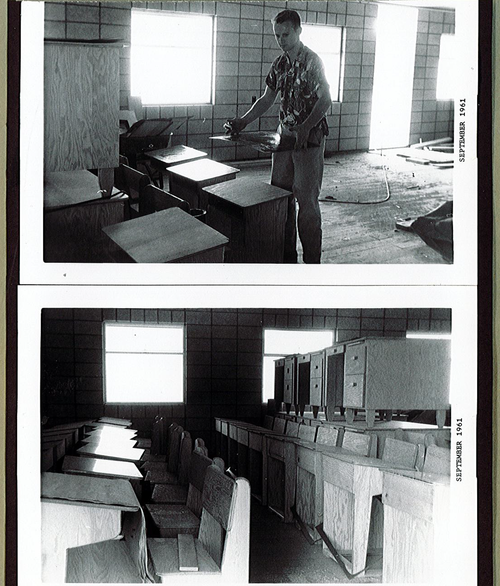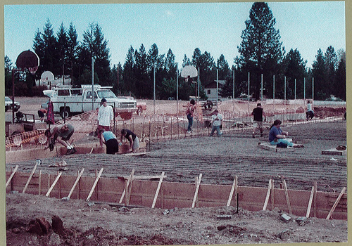 The beginning foundation for what is now the gym was created at this time as well, with the pour of a concrete slab to serve as a blacktop area for basketball games and recesses.